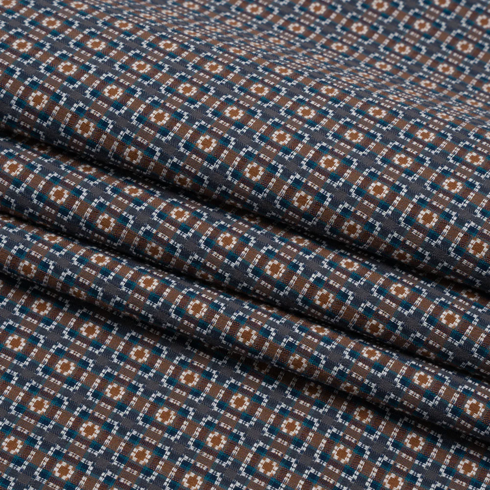 Geometric Cotton Dobby - Blue, Brown and White Rectangle Frames - Deadstock