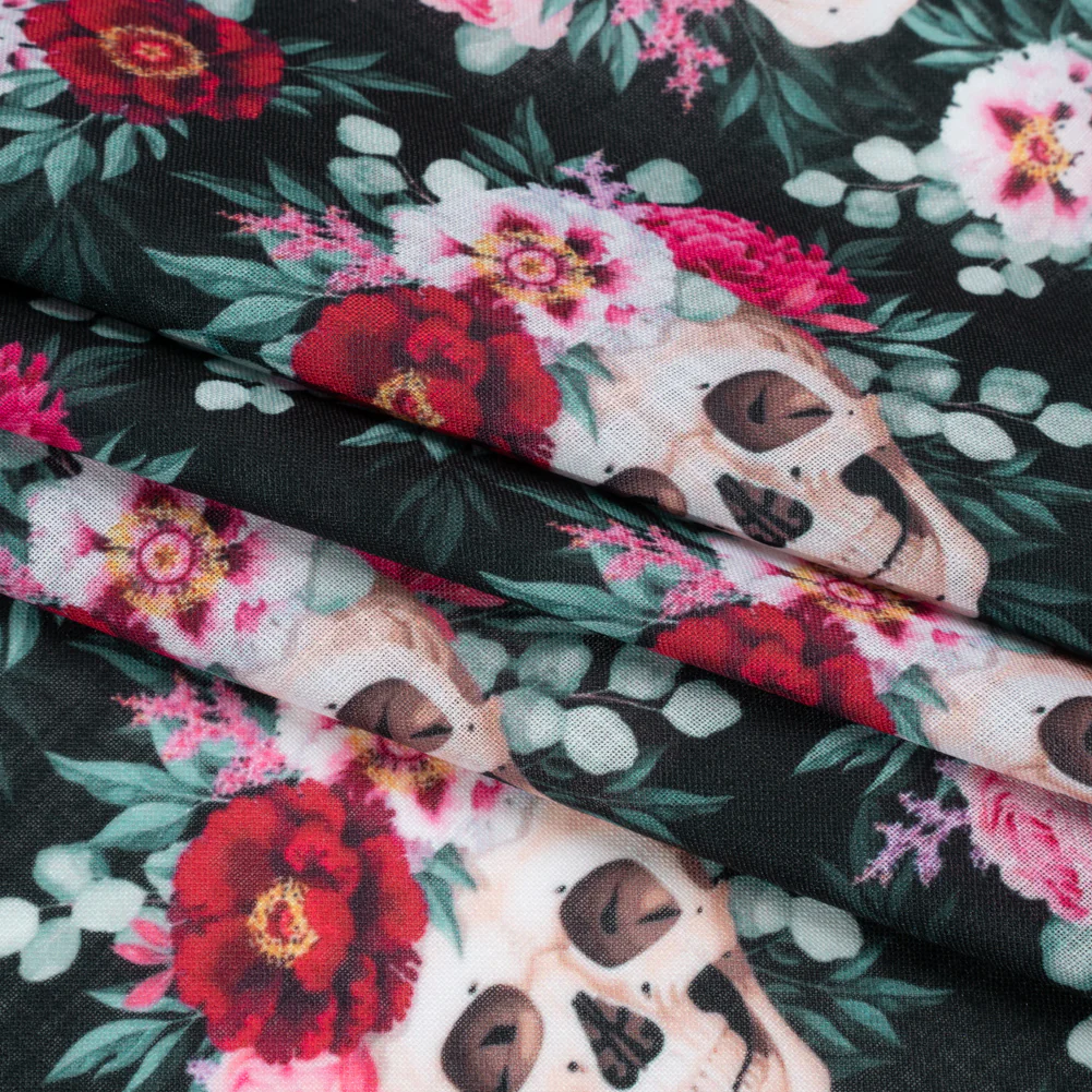 Medium Weight Linen and Cotton Woven - Black, Pink and Ivory Flower Skulls