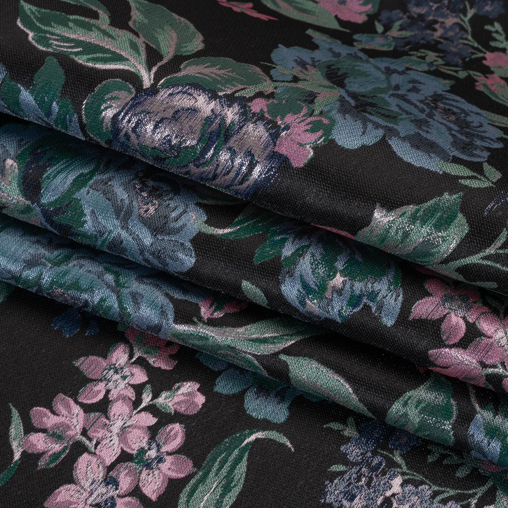 Metallic Luxury Brocade - Black, Blue and Baby Pink Classic Flowers