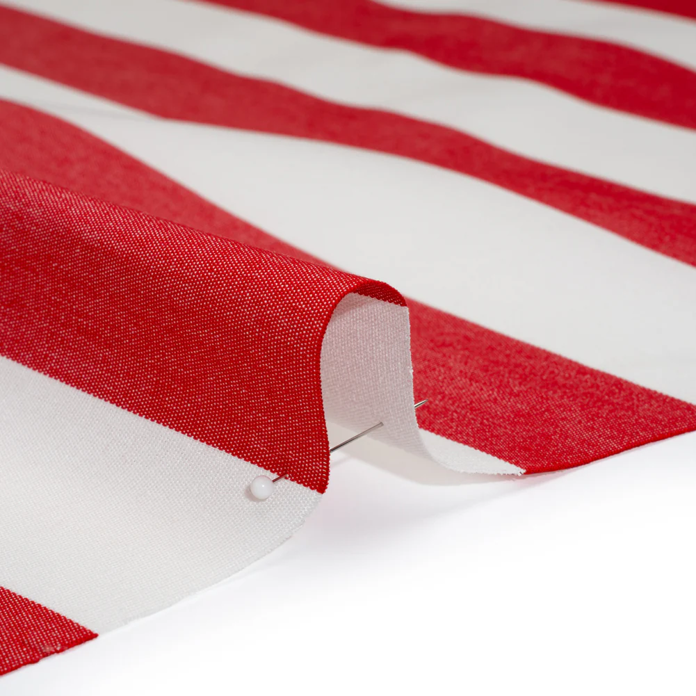 This Red and White Awning Striped Outdoor Canvas is peppermint perfection—featuring a tactile hand and stiff drape.