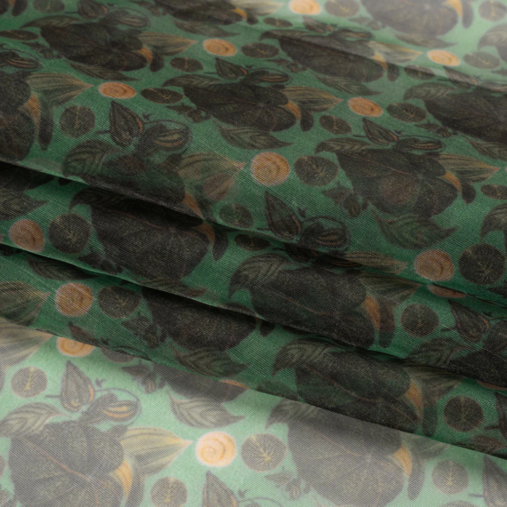 Polyester and Viscose Organza - Green and Teal Tropical Leaf Bunches