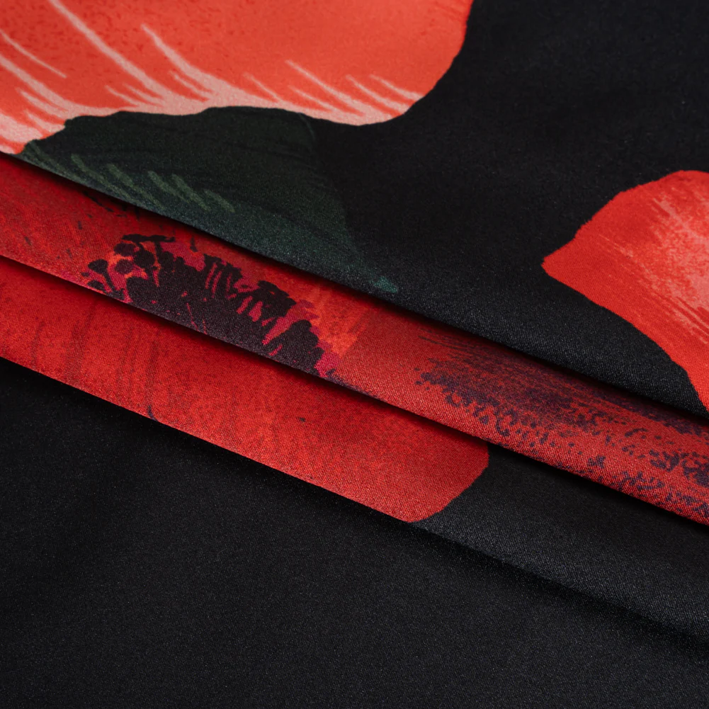 Silk Charmeuse Print - Black, Red and Green Big Poppies - Made in Italy—